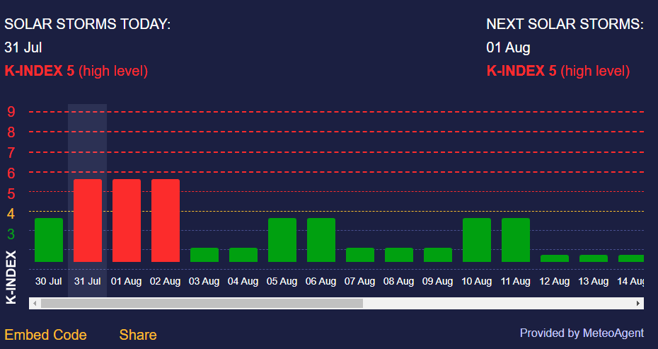 Нагадаємо, за прогнозом ресурсу Meteoagent, середню магнітну бурю варто очікувати уже 3 серпня. Вона сягне К-індексу 3,5.
