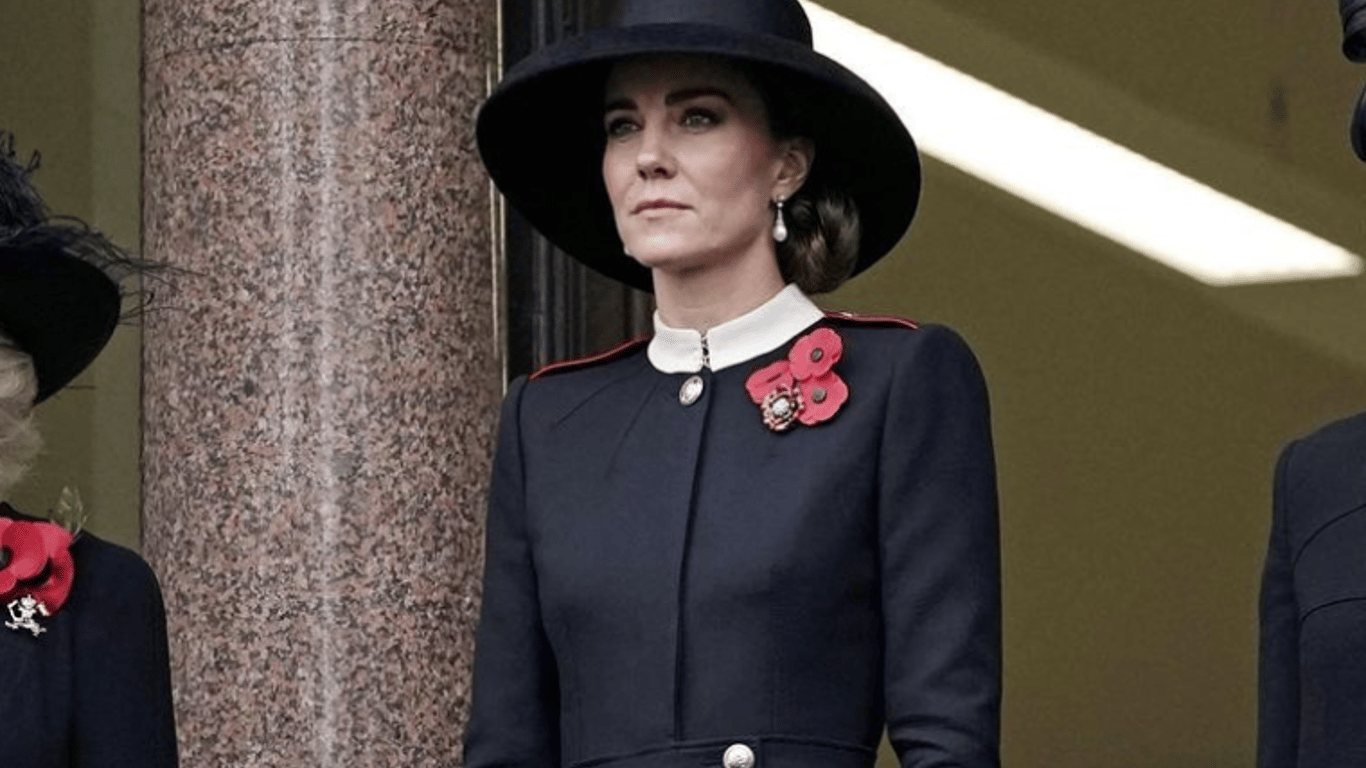 Кейт в сшитом на заказ пальто на мероприятии выглядела достаточно серьезно, и дополнила образ шикарной черной шляпой с заниженными полями от Tiffany за 275 фунтов стерлингов. Кстати, в таком образе мать троих детей напоминала аналогичный наряд принцессы Дианы в 1992 году на аналогичном мероприятии.